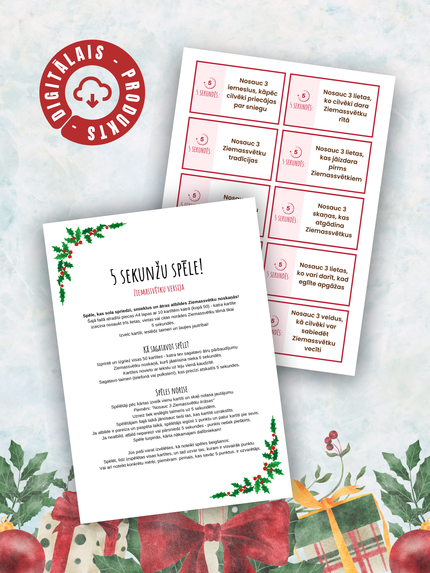 Aktivitāte Ziemassvētku noskaņās - "5 sekunžu spēle" - lieliska Ziemassvētku izklaide draugiem, ģimenei un bērniem! Šī drukājamā spēle būs ideāla aktivitāte Ziemassvētku ballītei, klases vakarā vai ģimenes svētku vakaram. Lai Ziemassvētku pasākums izdotos jautrs un neaizmirstams! 🎄
