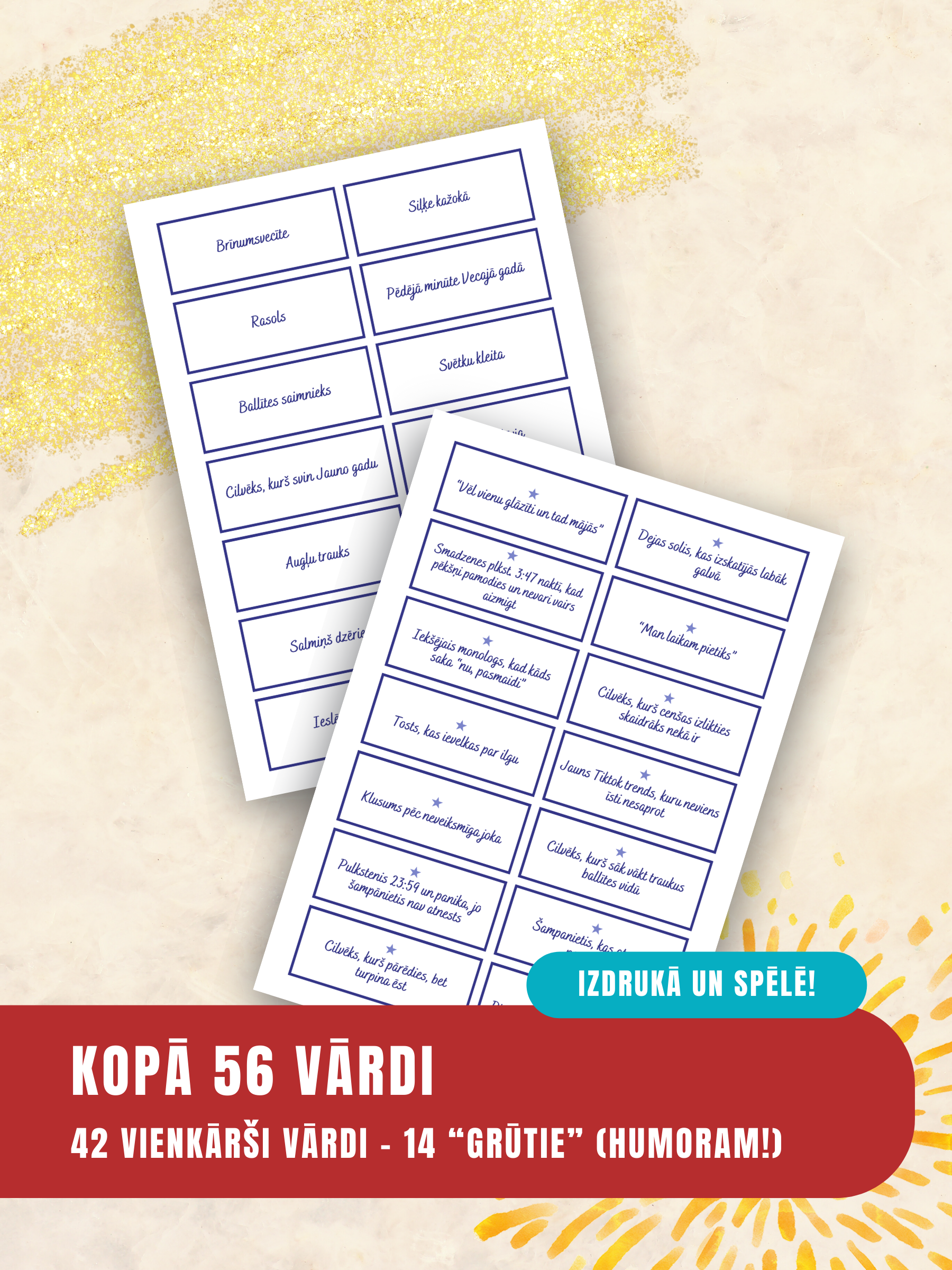 - 4 A4 lapas (uz katras 14 kartītes → kopā 56 kartītes)