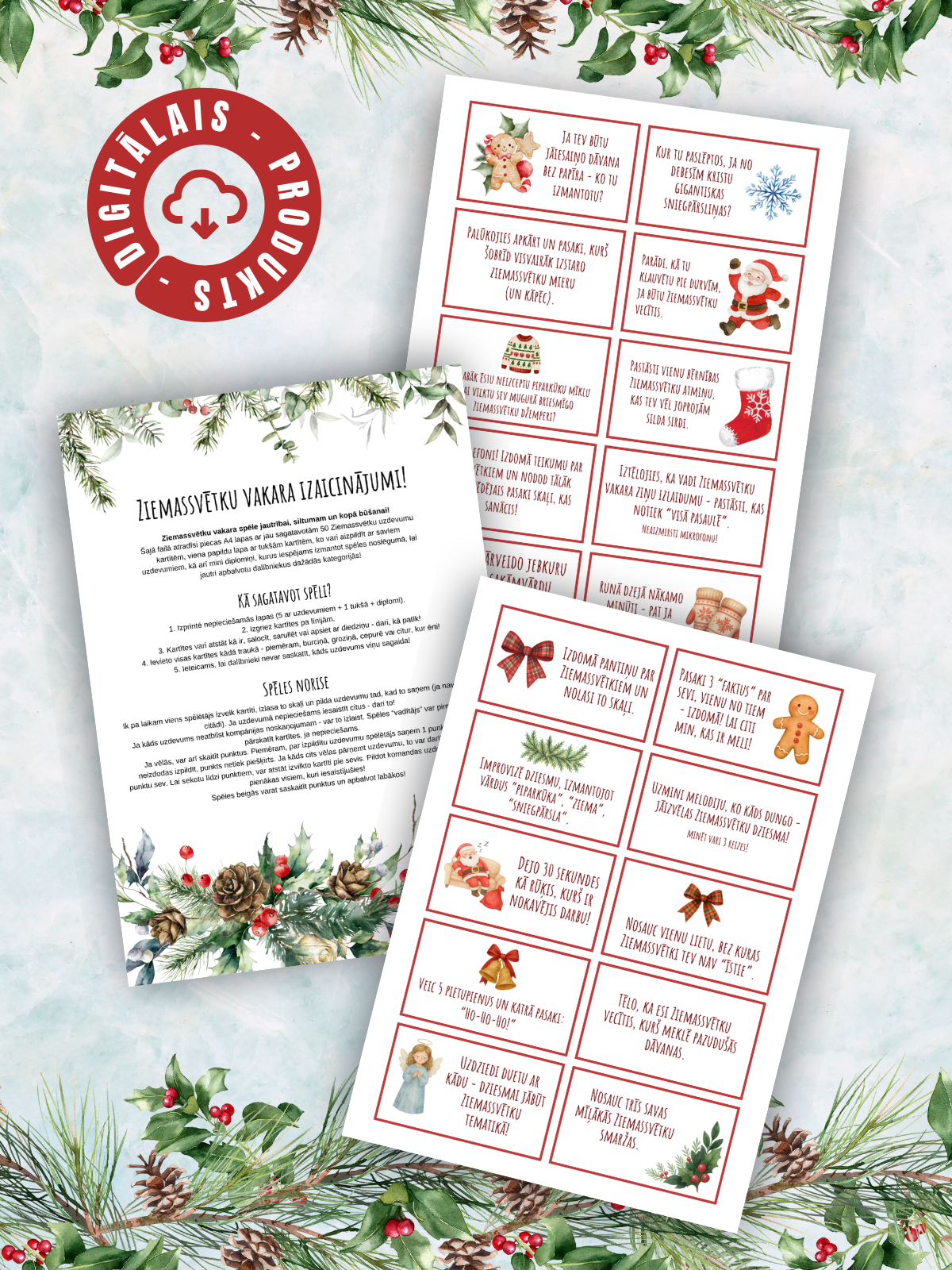 Izprintē kartītes, izgriez tās un ievieto burciņā, groziņā vai Ziemassvētku vecīša cepurē. Spēlētāji izvelk kartītes un pilda uzdevumus - var krāt punktus vai vienkārši baudīt kopā būšanas prieku.