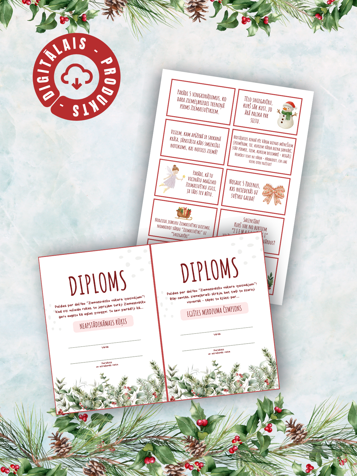 BONUSĀ: jauki mini diplomi, lai spēles beigās varētu apbalvot dalībniekus dažādās svētku kategorijās (piemēram, “Ziemassvētku gara nesējs”, “Radošākais rūķis” u.c.)