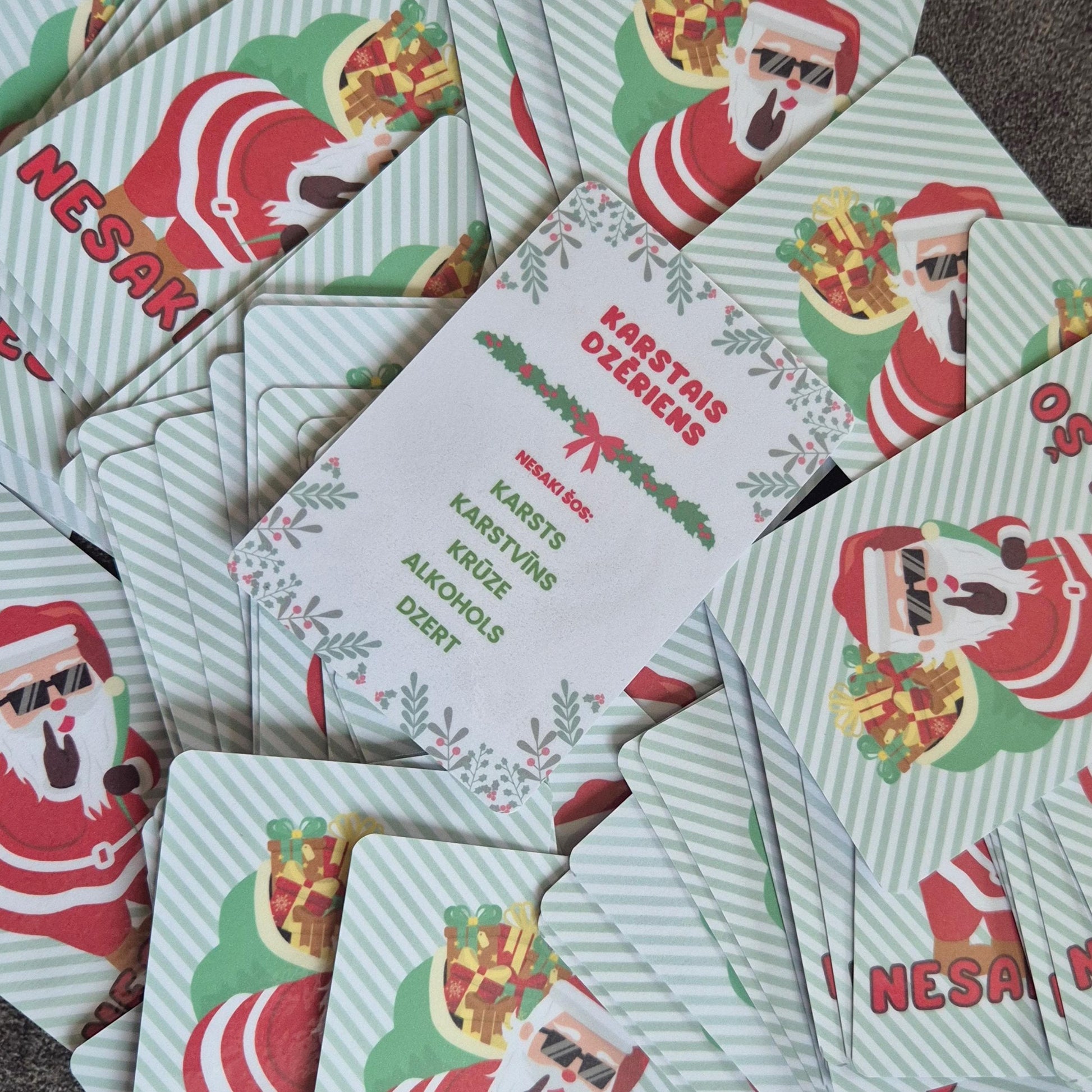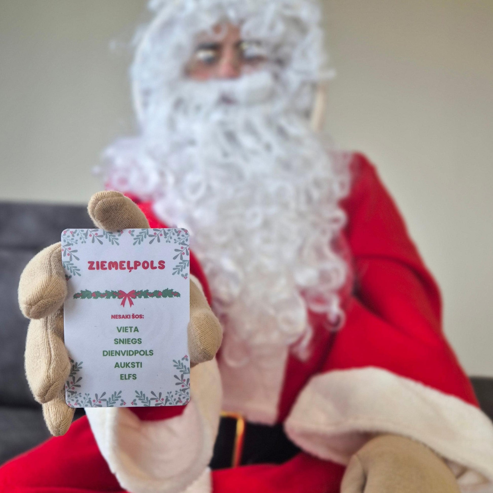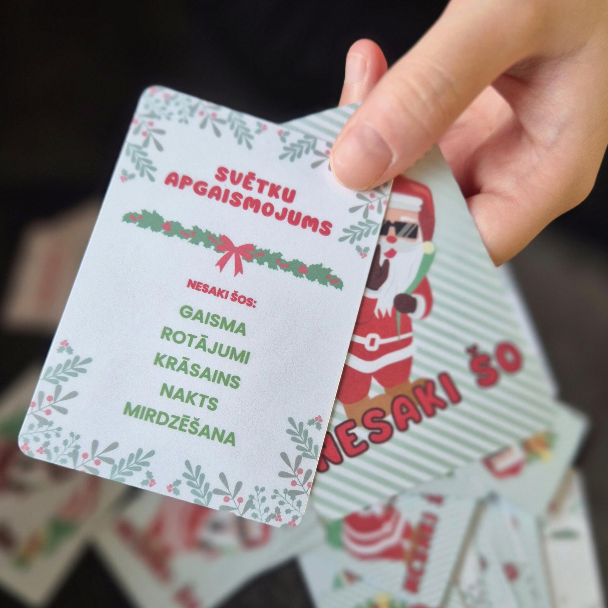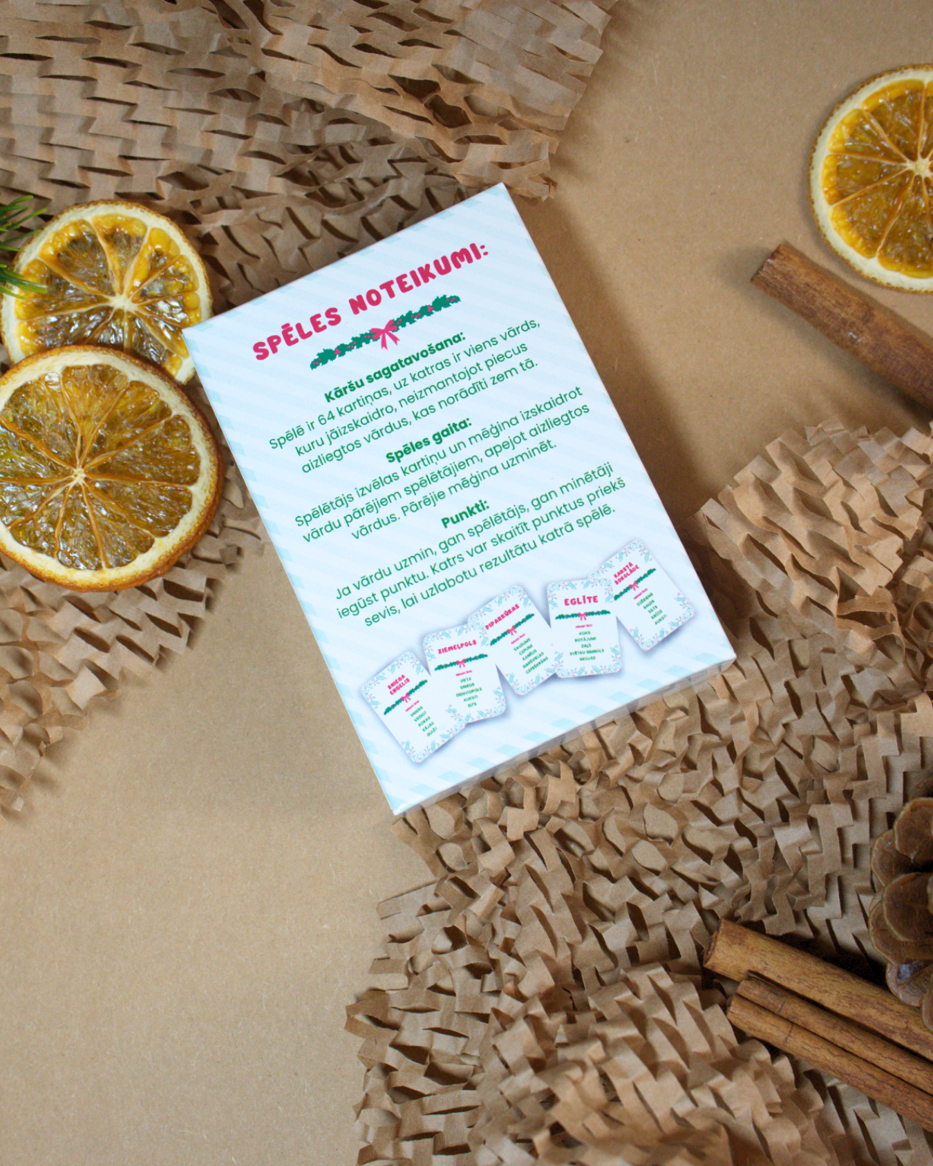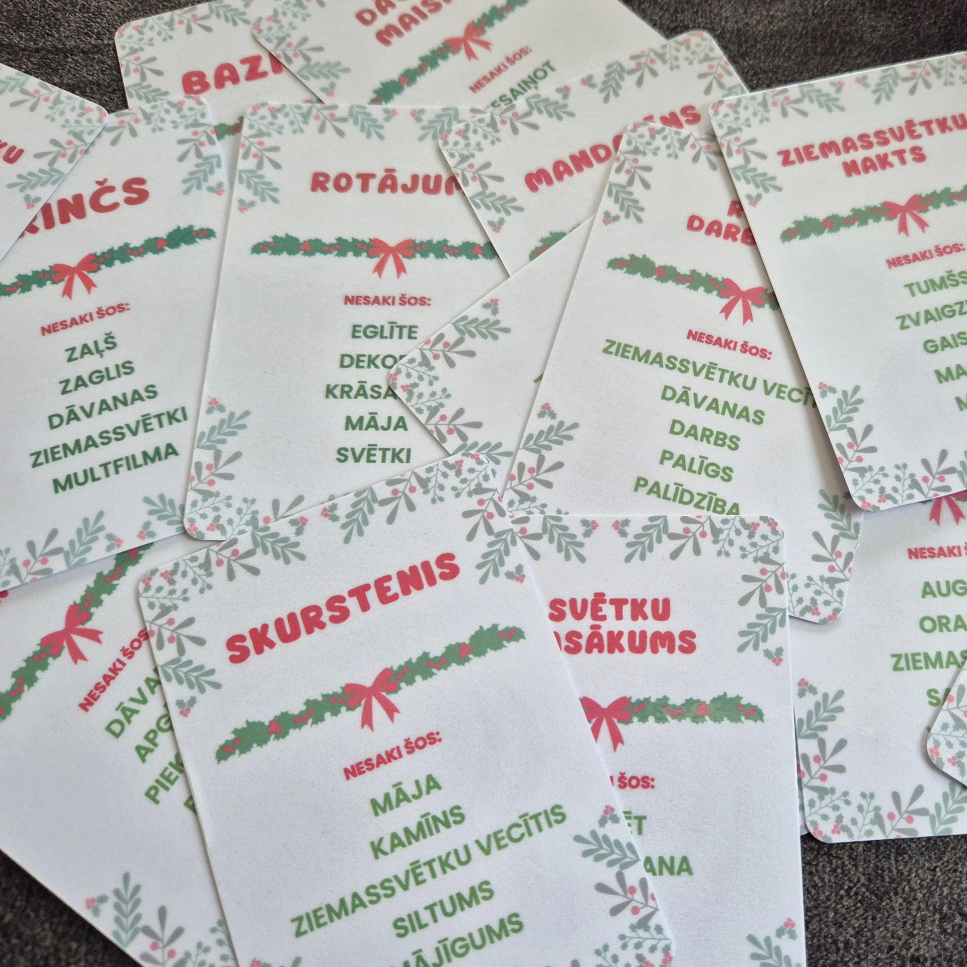 🃏 Sagatavošanās: Spēlē ir 64 kartiņas ar dažādiem vārdiem, kas saistīti ar Ziemassvētiem. Zem katra vārda norādīti 5 aizliegtie vārdi, kurus skaidrošanas laikā nedrīkst lietot!